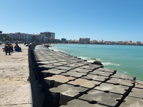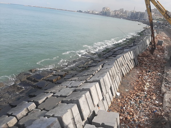وفى الإسكندرية أيضاً .. ولحماية كورنيش وشواطئ المدينة ، فإنه جارى تنفيذ عملية تدعيم وتطوير الكورنيش تجاه المنشية ومحطة الرمل لحماية سور الكورنيش الأثري وطريق الكورنيش من خلال إنشاء حائط بحرى بطول ٨٣٥ متر بإستخدام كتل خرسانية زنة ٥ طن وأحجار بتدرجات مختلفة ، وتنفيذ أعمال ترميم وصيانة البلاطات الخرسانية المجاورة لسور الكورنيش لمسافة ٣٥٠ متر ، بالإضافة لعملية إستكمال إنشاء سلسلة من الحواجز الغاطسة بالاسكندرية لحماية الشواطئ وطريق الكورنيش بمنطقة شاطئ السرايا وأمام فندق المحروسة ، من خلال إنشاء لسان بحرى على شكل حرف L امام فندق المحروسة بطول حوالى ٦٠٠ متر وإنشاء رصيف بحرى بطول ١٥٥ متر ، نظراً لتعرض المنطقة للأمواج العالية ، وسيسهم هذا المشروع فى إستعادة الشواطئ المفقودة بالنحر ، وهو ما يُمكن محافظة الأسكندرية من تعظيم الإستفادة من الإستثمارات المقامة بالمنطقة ، وجارى أيضاً تنفيذ مشروع حماية ساحل الإسكندرية من بئر مسعود حتى المحروسة من خلال إنشاء عدد (٢) من الحواجز الغاطسة أمام المنطقة بطول حوالي ١٦٠٠ متر تقريبا وبعرض ٤٠ متر وتغذية بالرمال بمنطقة الشاطئ خلف حواجز الأمواج الغاطسة بعرض حوالى ٣٠ متر