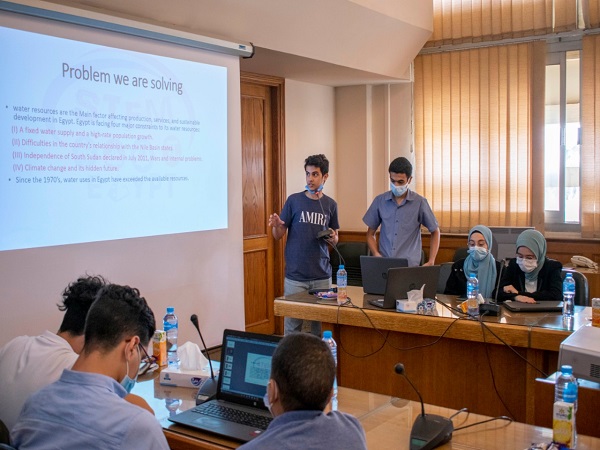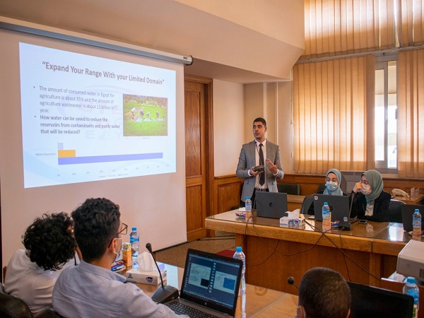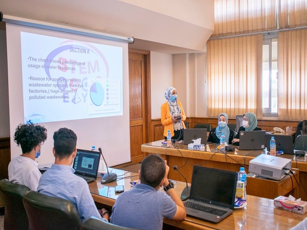 وقد ركزت الابحاث المقدمة من الطلاب علي محور تحسين نوعية المياه والذى يعد المحور الاول من محاور استرتيجية الوزاره ، حيث قام الطلاب خلال اللقاء بعرض عدد (٦) أبحاث في مجال معالجة المياه مثل استخدام راتنجات التبادل الأيوني ومياه الأكسجين وفلتر لتحسين جودة المياه ، وإستخدام عملية الامتصاص والكربون النشط في تنقية المياه من المواد العضوية والغير عضوية والمواد الدقيقة ، وإستخدام النيتروجين ونبات المورنجا لتقليل نسبه الأكسجين الكيميائي في المياه ليُعاد استخدامها في مرحله تبريد الحديد والصلب ، وإستخدام قشور البرتقال المعدلة في القضاء علي تلوث المعادن الثقيلة عن طريق جعلها غير قابلة للذوبان في المياه والتربة ، وإعادة تدوير المياه الناتجة عن الصناعات الغذائية التي تحتوي علي مواد عضوية عن طريق تنشيط البكتيريا الغير ضارة داخل الماء وتهيئة مناخ مناسب لها للتكاثر والتخلص من المعادن والملوثات العضوية داخل المياه ، ومعالجة المياه العادمة البيولوجية بإستخدام الطحالب الخضراء التي تمتص الفوسفات والنترات والمركبات العضوية من مياه الصرف الزراعي واستخدامها كمغذيات للنمو مع إستخدام نظام ري ذكي مزود بخاصية التحكم عن بعد لري الحبوب