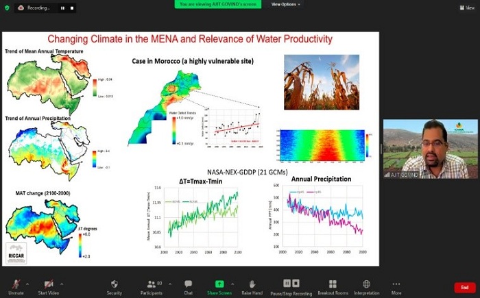 تحديد قيم النتح بخر للنباتات المقاسة اعتماداّ على بيانات الاستشعار عن بعد : الدروس المستفادة، والنتائج والتطبيقات ، وتم عقد هذه الجلسة الفنية برعاية المركز الدولي للبحوث الزراعية في المناطق الجافة (إيكاردا) ، وقد تضمنت وضع الأسس لفهم مشترك ومنهجية معتمدة للمقارنة بين نتائج الاختبار الميداني مقابل اختبار تحديد قيم النتح بخر للنباتات المقاسة اعتماداّ على بيانات الاستشعار عن بُعد، كما أكدت على ضرورة رفع الوعي في حالة قصر توافر المعلومات ذات الصلة بالمنهجية المستخدمة، بالإضافة إلى استخلاص استنتاجات أولية حول درجة دقة النموذج المستخدم لتحديد قيم النتح والبخر باستخدام الاستشعار عن بُعد بالمقارنة بقواعد البيانات