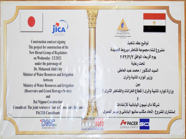 شهد السيد الدكتور/ محمد عبد العاطى وزير الموارد المائية والرى حفل توقيع عقد “مشروع إنشاء مجموعة قناطر ديروط الجديدة” الواقعة على بحر يوسف بمحافظة أسيوط ، بين السيد المهندس/ إيهاب عبد الله الجوهرى رئيس قطاع الخزانات والقناطر الكبرى ممثلاُ عن وزارة الموارد المائية والرى ، والسيد المهندس/ هايديمى هاتانو مدير شركة داى نيبون اليابانية ، وذلك بحضور السيد الدكتور/ رجب عبد العظيم وكيل الوزارة والمشرف على مكتب الوزير ، والسيد المهندس/ السيد شلبى رئيس مصلحة الرى ، والسيد المهندس/ محمود رافع رئيس الإدارة المركزية للدراسات والتصميمات بقطاع الخزانات ، والسيد المهندس/ عز الدين محمود المهندس المقيم للمشروع ، وممثلين عن هيئة التعاون الدولى اليابانية (جايكا) ، والمكتب الإستشارى اليابانى (سانيو)