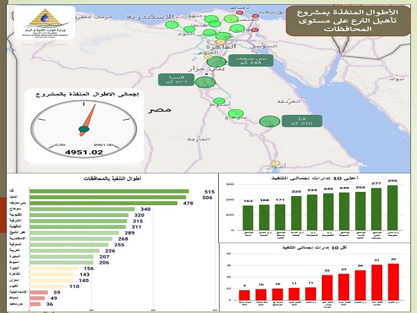 وصرح الدكتور عبد العاطى أنه تم الإنتهاء من تأهيل ترع بأطوال تصل الى ٤٩٥١ كيلومتر بمختلف محافظات الوادى والدلتا ، من أعلاها ٥١٥ كيلومتر بمحافظة قنا و ٥٠٦ كيلومتر بمحافظة المنيا و ٤٧٨ كيلومتر بمحافظة بنى سويف و ٣٤٠ كيلومتر بمحافظة سوهاج و ٣٢٠ كيلومتر بمحافظة القليوبية و ٣١٥ كيلومتر بمحافظة الشرقية و ٣١١ كيلومتر بمحافظة الدقهلية و ٢٨٩ كيلومتر بمحافظة كفر الشيخ و ٢٦٨ كيلومتر بمحافظة الإسكندرية و ٢٥٥ كيلومتر بمحافظة المنوفية