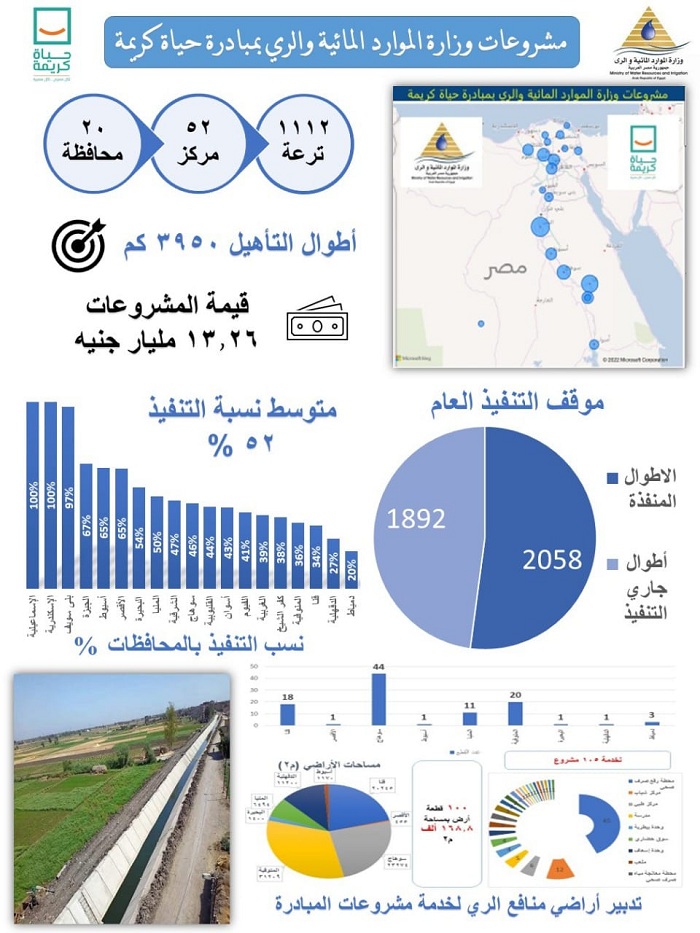 وقد بلغت أطوال الترع التى تم تأهيلها بمراكز حياه كريمة حوالى ٢٠٥٨ كم ، وجارى العمل في ترع بأطوال تصل إلى ١٨٩٢ كيلومتر ، ليصل بذلك إجمالى أطوال التأهيل بمركز حياه كريمة لـ ٣٩٥٠ كيلومتر ، كما إنتهت الوزارة من تنفيذ عدد (٤) عمليات للحماية من أخطار السيول بمحافظات المنيا وأسوان والجيزة تشتمل على إنشاء بحيرات وحواجز وسدود إعاقة ، وتم الإنتهاء من تشغيل عدد (٨) آبار جوفية بالطاقة الشمسية بالفرافرة بمحافظة الوادى الجديد ، وتنفيذ أعمال حماية لجوانب نهر النيل بطول ٤٢٠ متر بمركزى ملوى ودير مواس بمحافظة المنيا