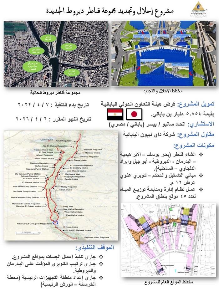 وصرح الدكتور عبد العاطى أن مشروع إنشاء مجموعة قناطر ديروط الجديدة على ترعة الإبراهيمية يشتمل على إنشاء عدد (٧) قناطر هي (فم بحر يوسف – الابراهيمية – البدرمان – الديروطية – أبو جبل – إيراد الدلجاوي – الساحلية) وإنشاء مباني للتشغيل والتحكم وعمل كوبري علوي ومنظومة لإدارة ومتابعة توزيع المياه لعدد ٤٥ موقع بنطاق المشروع