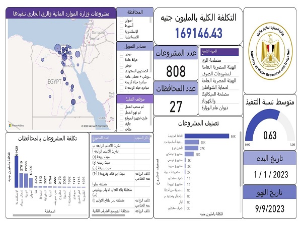 ** العمل على تنفيذ (٨٠٨) مشروع بكافة أنحاء الجمهورية بتكلفة ١٧٠ مليار جنيه موزعة على عدة سنوات ، وبمتوسط نسبة تنفيذ حوالى ٦٣%