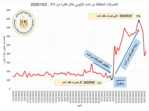 تتابع وزارة الموارد المائية والري تطورات فيضان نهر النيل لهذا العام، وما ارتبط بها من تصرفات أحادية متهورة من جانب إثيوبيا في إدارة سدها غير الشرعي المخالف للقانون الدولي. هذه الممارسات تفتقر إلى أبسط قواعد المسؤولية والشفافية، وتمثل تهديداً مباشراً لحياة وأمن شعوب دول المصب، كما تكشف بما لا يدع مجالاً للشك زيف الادعاءات الإثيوبية المتكررة بعدم الإضرار بالغير، وتؤكد أنها لا تعدو كونها استغلالاً سياسياً للمياه على حساب الأرواح والأمن الإقليمي.