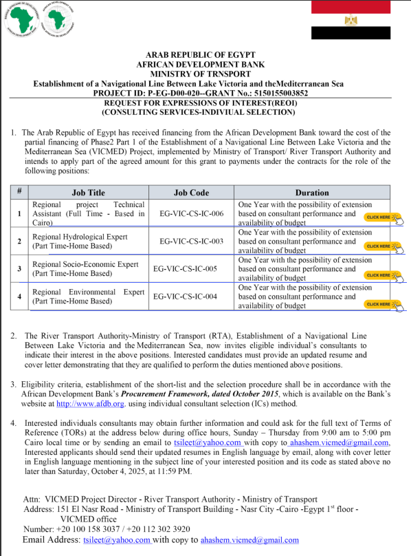 إعلان عن فرص عمل واستشارات متاحة ضمن مشروعات وزارة النقل-مشروع الخط الملاحي بين بحيرة فيكتوريا والبحر المتوسط إعلان