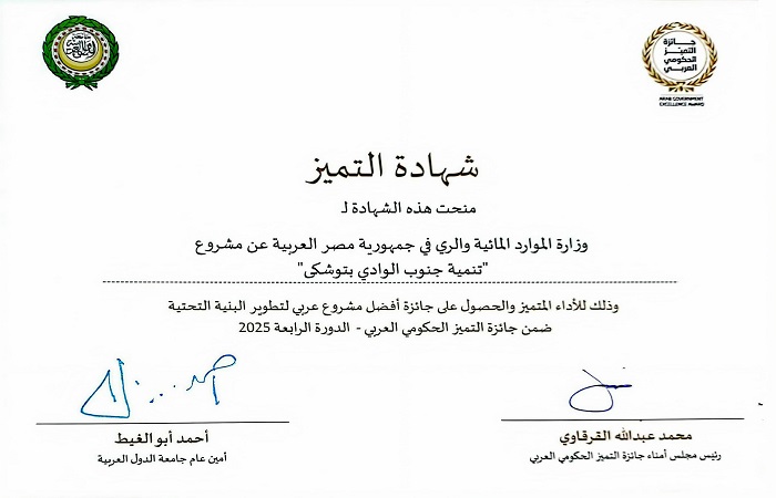 ** وزارة الموارد المائية والري تحصد “جائزة أفضل مشروع عربي لتطوير البنية التحتية عن مشروع تنمية جنوب الوادى” ضمن جائزة التميز الحكومي العربي ٢٠٢٥