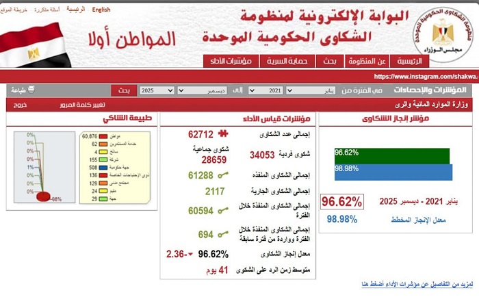 جدير بالذكر أن مؤشر إنجاز الشكاوى بوزارة الموارد المائية والرى بمنظومة الشكاوى الحكومية الموحدة بمجلس الوزراء أوضح أن الوزارة قامت ببحث ودراسة عدد (١١٧٧) شكوي وطلب وإستغاثة خلال شهر ديسمبر ٢٠٢٥، وأن نسبة حسم الشكاوى خلال الفترة من يناير ٢٠٢١ حتى نهاية شهر ديسمبر ٢٠٢٥ بلغت (٩٦.٦٢ ٪)