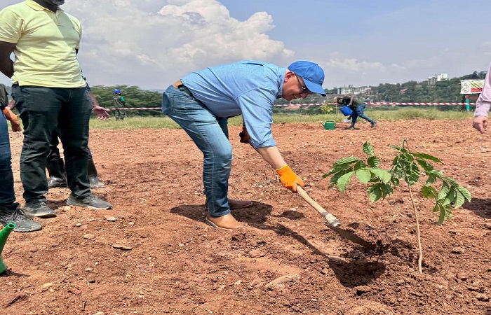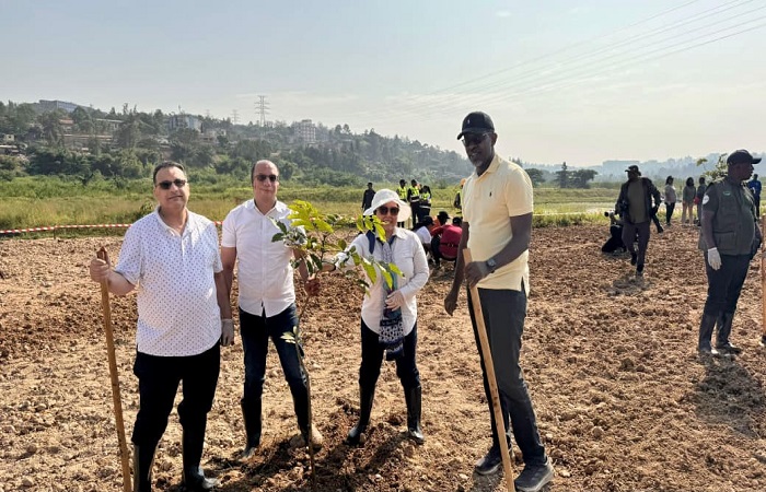 الدكتور/ هاني سويلم، وسفيرة مصر لدى رواندا، وعدد من أعضاء الوفد المصرى يقوموا بزراعة عدد من الأشجار فى لفتة رمزية تعكس الاهتمام المشترك بحماية البيئة وتعزيز الحلول القائمة على الطبيعة