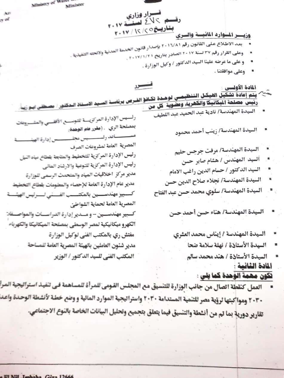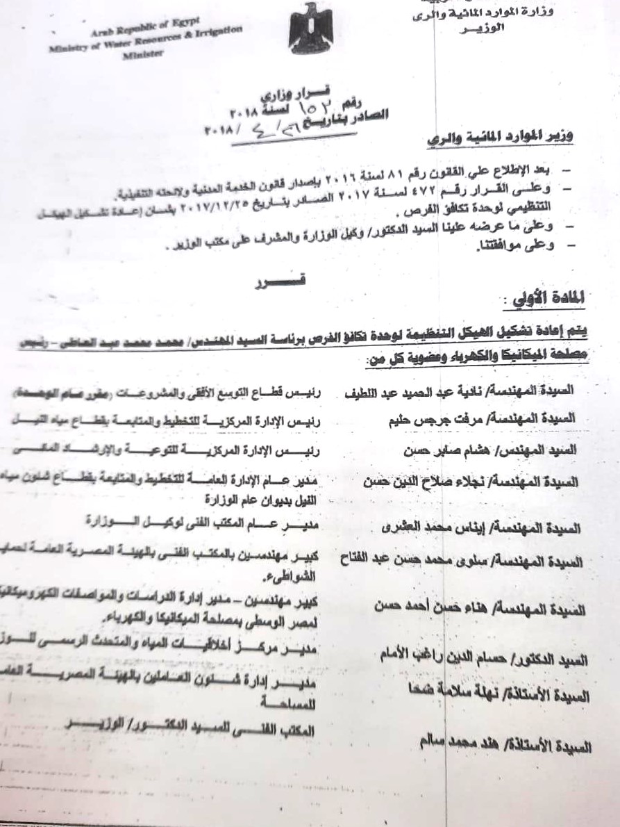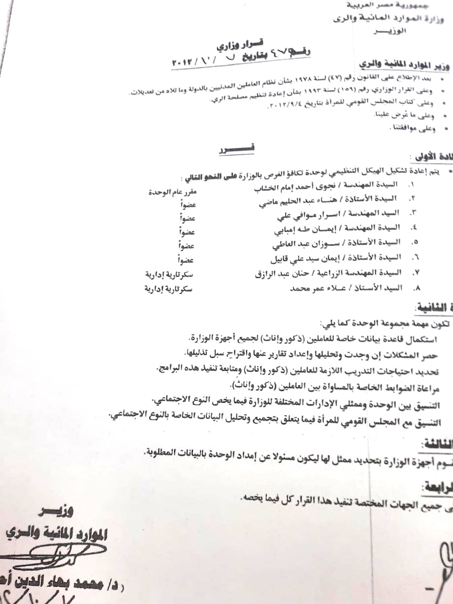 إنشاء وحدة تكافؤ الفرص بوزارة الموارد المائية والري، لتكون آلية مؤسسية تعمل على دعم قضايا المساواة وتمكين العاملين، مع تعزيز التعاون مع الجهات المعنية وعلى رأسها المجلس القومي للمرأة.