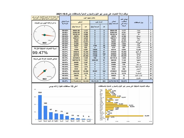 فى ضوء حملات الازالات الكبرى للتعديات على نهر النيل والمجارى المائية واملاك الرى والجارى تنفيذها حاليا طبقا لتكليفات السيد/ عبد الفتاح السيسي رئيس الجمهورية .. مرفق العداد اليومى للازالات فى نسخته الاولى ، والذى سيتم تحديثه يوميا بإضافة الازالات الجديدة