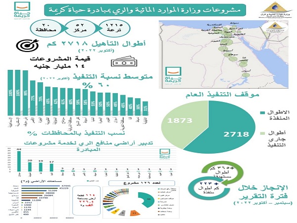 حيث تم ويجرى تأهيل ترع بأطوال إجمالية ٤٥٩١ كيلومتر بمراكز حياه كريمة ، حيث بلغت أطوال الترع التى تم نهو تأهيلها حوالى ٢٧١٨ كيلومتر ، وجارى العمل في ترع بأطوال تصل إلى ١٨٧٣ كيلومتر ، كما إنتهت الوزارة من تنفيذ عدد (٢) عملية للحماية من أخطار السيول بمحافظات المنيا وأسوان وجارى العمل بعدد (٤) عمليات للحماية من أخطار السيول بمحافظة الجيزة ، تشتمل على إنشاء بحيرات وحواجز وسدود إعاقة وأحواض تهدئة ، كما تم الإنتهاء من تشغيل عدد (٨) آبار جوفية بالطاقة الشمسية بالفرافرة بمحافظة الوادى الجديد ، وتنفيذ أعمال حماية لجوانب نهر النيل بطول ٤٢٠ متر بمركزى ملوى ودير مواس بمحافظة المنيا.
