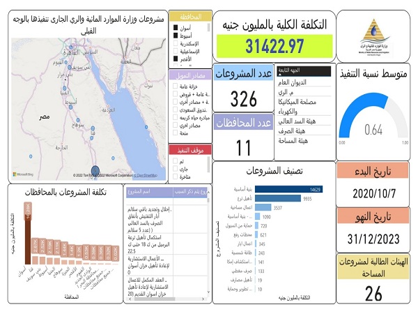 هذا ويتم متابعة معدلات التنفيذ للمشروعات بمختلف أجهزة الوزارة من خلال منظومة دعم قرار تفاعلية تتيح لمتخذ القرار استعراض جميع المؤشرات الخاصة بالمشروعات والمتمثلة في (جهة التنفيذ – مواقع المشروعات – متابعة تواريخ النهو المقررة – موقف التنفيذ – ….. إلخ) ، بالإضافة لتصنيف المشروعات من حيث (جهة التمويل ونوعه – طبيعة المشروعات – العائد والجدوى منها ….. إلخ) ومتوسط نسب التنفيذ والتكلفة بكل محافظة.
