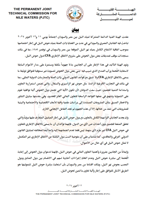 The Permanent Joint Technical Commission for Nile Waters (PJTC) convened a meeting on the 11th and 12th October 2024 to discuss several key water issues pertaining to the Nile Basin. This meeting was held in accordance with the Commission’s mandate under the 1959 Nile Waters Agreement between Egypt and Sudan. Among the pivotal issues addressed were recent developments regarding the ratification of the so-called “Cooperative Framework Agreement (CFA)” by some Nile Basin States.