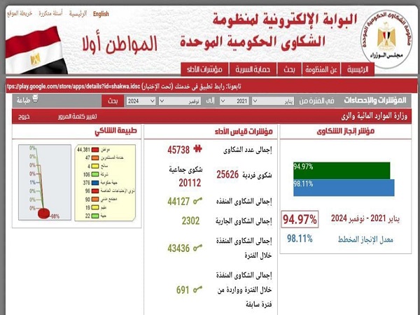 وأضاف سيادته أن مؤشر إنجاز الشكاوى بوزارة الموارد المائية والرى بمنظومة الشكاوى الحكومية الموحدة بمجلس الوزراء أوضح أن الوزارة قامت ببحث ودراسة عدد (١٣٣٤) شكوي وطلب وإستغاثة خلال شهر نوفمبر ٢٠٢٤ ، وأن نسبة حسم الشكاوى خلال الفترة من يناير ٢٠٢١ حتى نهاية شهر نوفمبر ٢٠٢٤ بلغت (٩٤.٩٧ ٪)