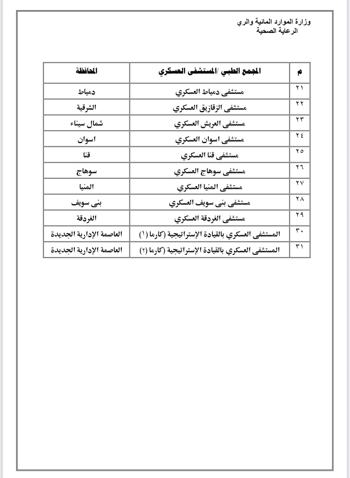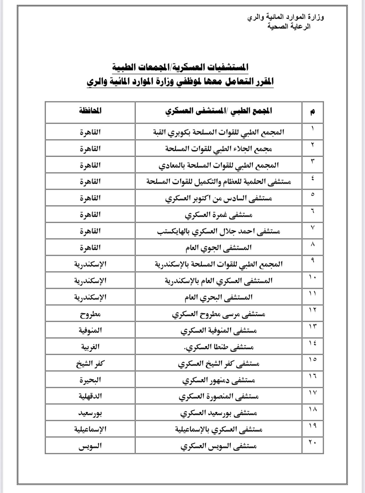 فى إطار ما توليه وزارة الموارد المائية والري من رعاية واهتمام متعاظم بمنظومة المساعدات الصحية للعاملين بها، وبفضل المتابعة الدقيقة والتوجيهات المستمرة من السيد الأستاذ الدكتور/ هاني سويلم – وزير الموارد المائية والري، بضرورة الارتقاء بمستوى الخدمات الطبية المقدمة للسادة العاملين وأسرهم في مختلف القطاعات والجهات التابعة للوزارة بجميع محافظات الجمهورية .. فقد تم إبرام بروتوكول تعاون متميز مع المستشفيات العسكرية والمجمعات الطبية التابعة لوزارة الدفاع على مستوى الجمهورية .
