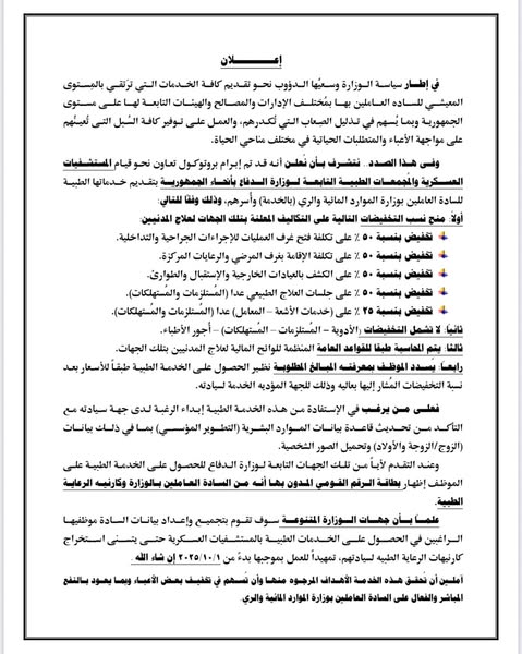 وبموجب هذا البروتوكول، ستقوم المستشفيات والمجمعات الطبية العسكرية بتقديم خدماتها الطبية المتكاملة للسادة العاملين بالوزارة وأسرهم طوال مدة خدمتهم، بما يضمن لهم أعلى مستويات الرعاية الصحية، علما بأنه لن يتم تحصيل أى رسوم من قبل الوزارة مقابل الاشتراك فى هذه الخدمة أو مقابل استصدار الكارنيه .