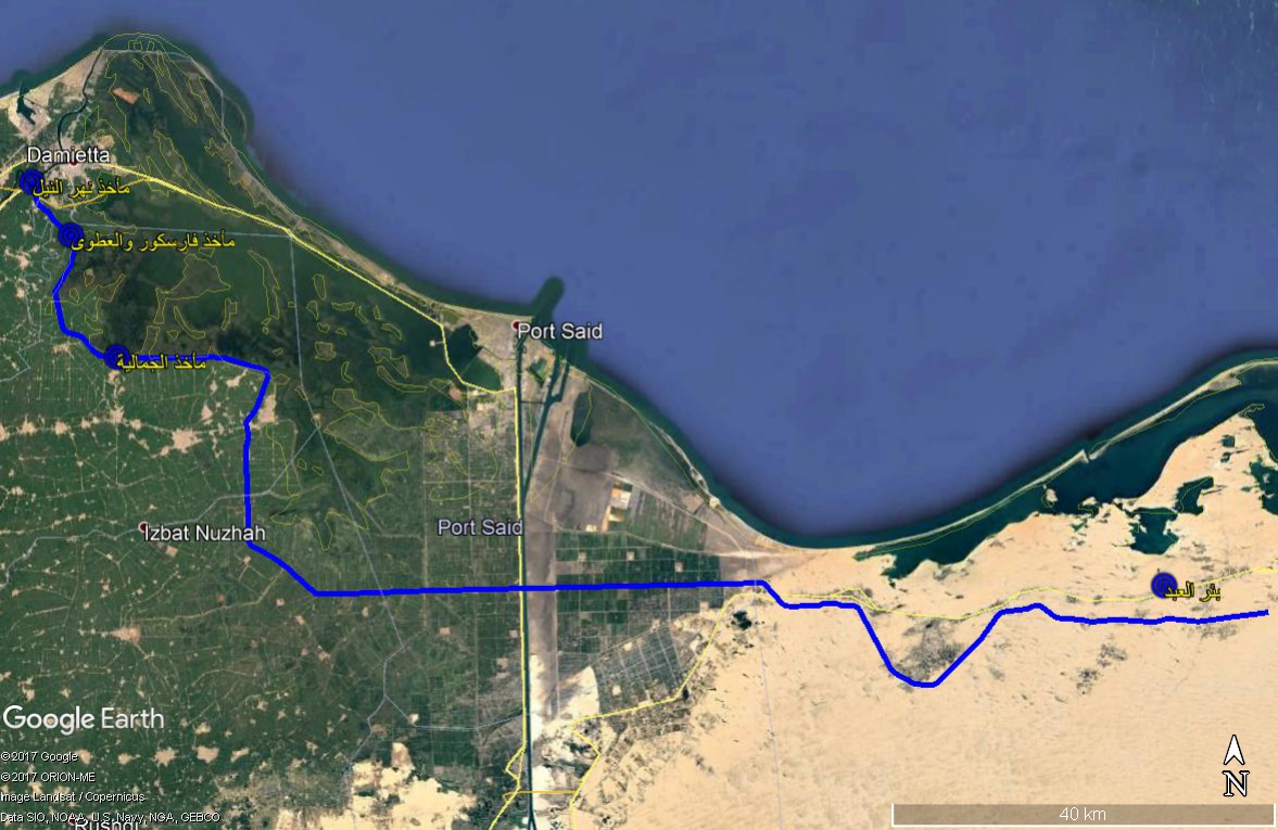 وتسير الترعة بطول 62 كم في مناطق رابعة وبئر العبد ذات الطبيعة الرملية والترعة مبطنة بالخرسانة العادية في هذه المسافة لنظرا لطبيعة التربة الرملية عالية النفاذية